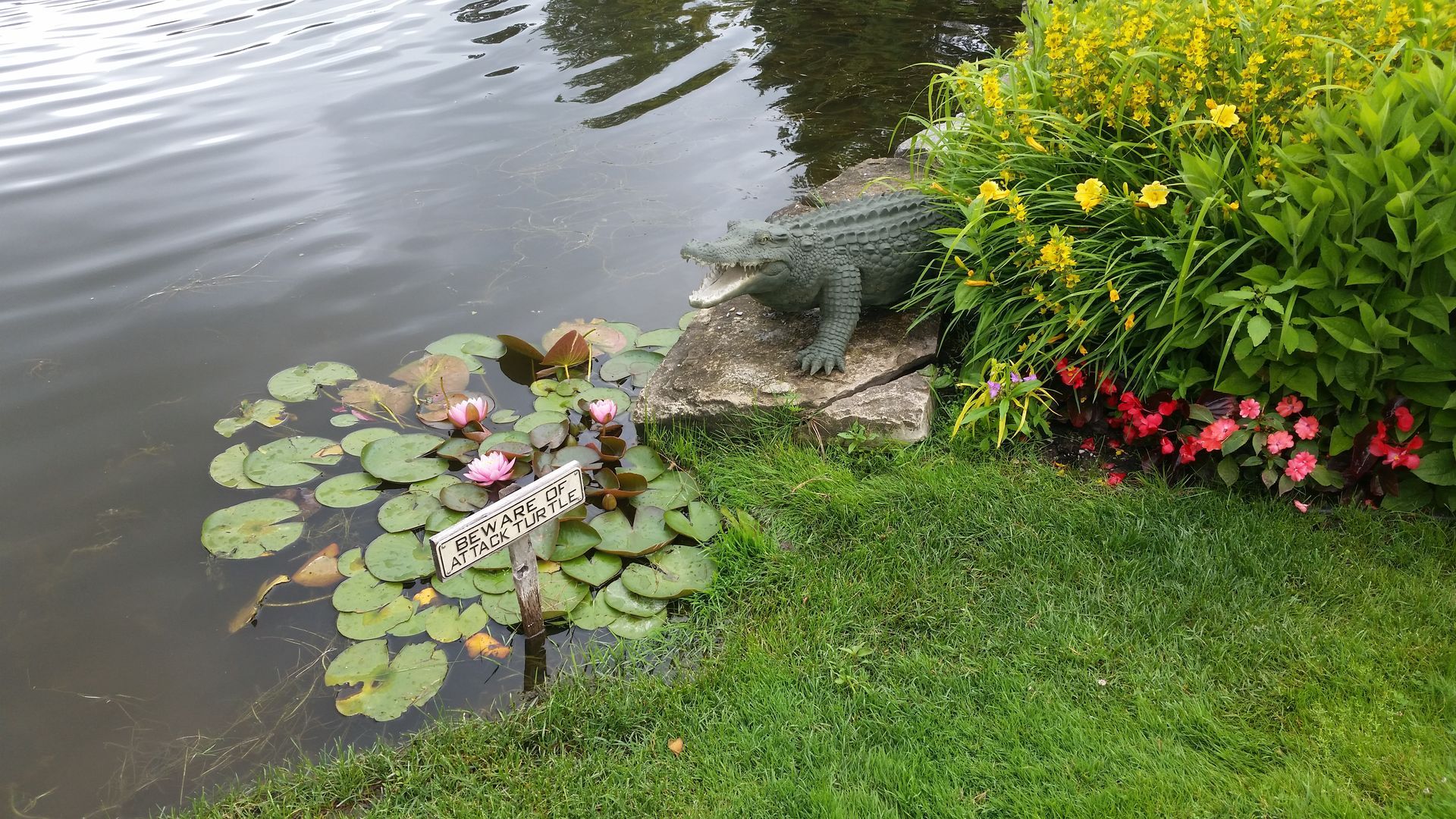 The light waterfall feature rambles down the centre, circulating back into the pond while a stone bridge takes you to the far side where benches are tucked in corners for your comfort. It is a natural habitat for plentiful goldfish in the pond, turtles sunning on “turtle log” and varieties of song birds and fishers that hug the shoreline.